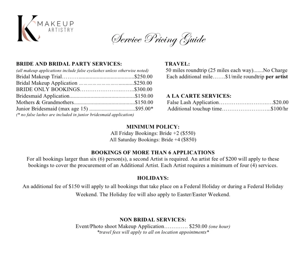 All makeup applications include false lashes and a lip touchup kit. The Bride will receive a custom touchup kit with all necessary items for minor touchups throughout the day/night. Below you will find an outline of my services and pricing. Please reach out with any questions you may have!